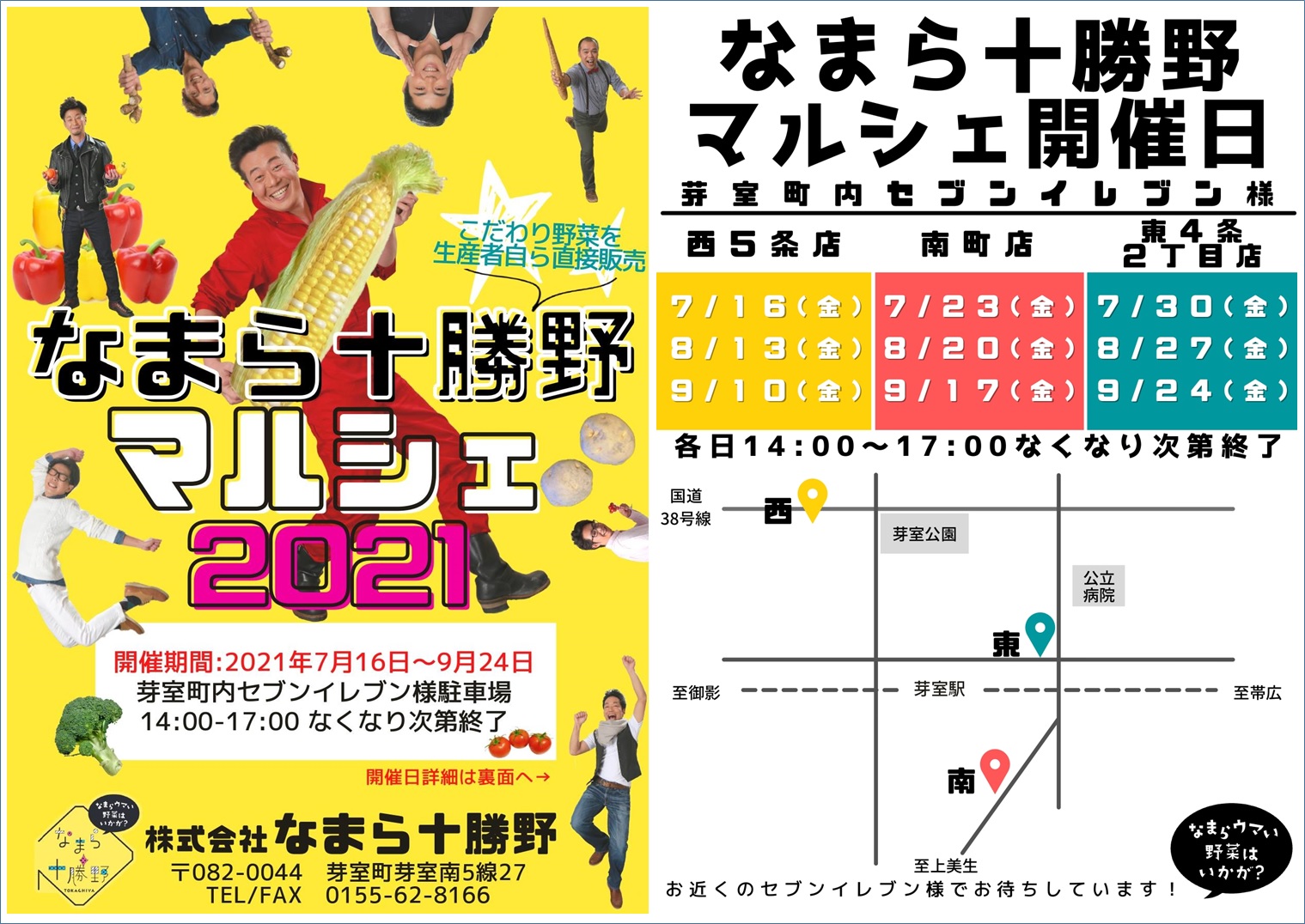| 大変長らくお待たせいたしました!今年はやります、なまら十勝野マルシェ👏 芽室町内のセブンイレブン様の駐車場をお借りして、なまら十勝野の生産者が直接販売に伺います♪ 👉週ごとに開催店舗が決まっていますので、各開催日についてはチラシをご覧ください。 マルシェご来店の皆さまへのお願い ◆熱がある方、体調がすぐれない方のご来店はご遠慮下さい。 ◆手指消毒用アルコールを設置いたしますのでご利用下さい。 ◆新型コロナウイルス感染症対策にご協力をお願いいたします。 ◆状況により中止または延期となる場合はご理解お願いいたします。 ✨チラシの拡大版はこちらから!! |